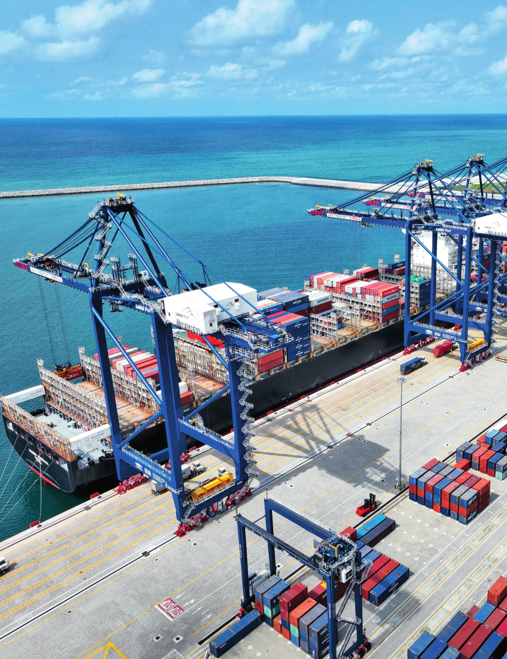 由中国港湾工程有限责任公司承建的尼日利亚莱基深水港位于中尼合作建设的拉各斯莱基自贸区内,是尼日利亚首个现代化深水港和最大港口。图为一艘货轮在尼日利亚拉各斯莱基深水港装卸集装箱(2024年3月11日摄)莱基港公司供图