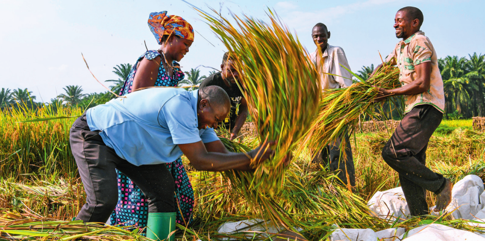 2018年,中国农业专家组在布隆迪布班扎省吉汉加县设立首个水稻减贫示范村。图为当地农户在稻田里给杂交水稻脱粒(2023年6月20日摄)韩旭摄/本刊