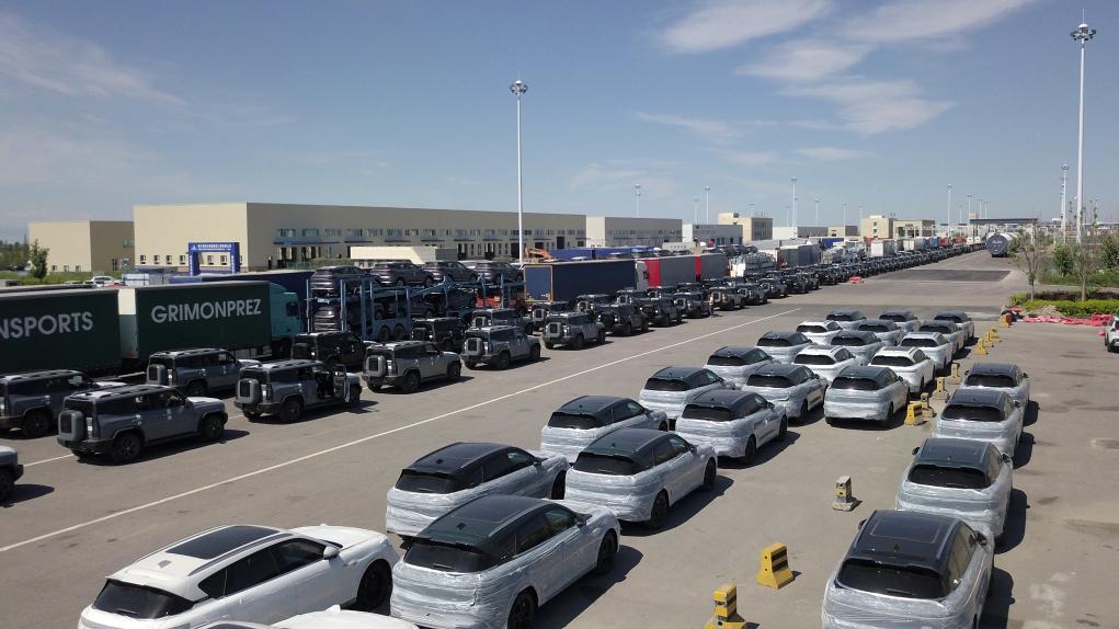 7月11日,在新疆霍尔果斯公路口岸,出口车辆排队等待查验出关(无人机照片)。作为全国最大的汽车出口陆路口岸——霍尔果斯口岸今年汽车整车出口数量迅猛增长。
