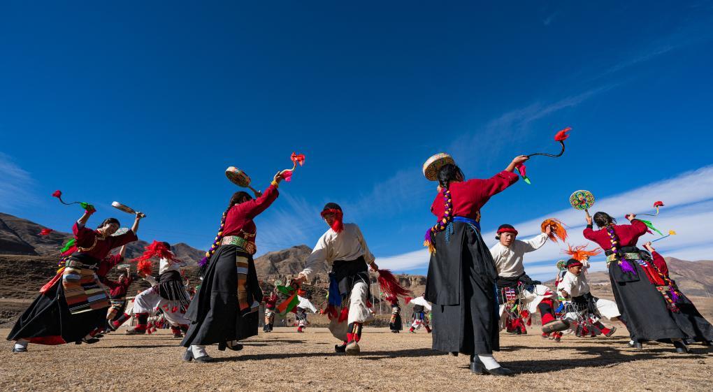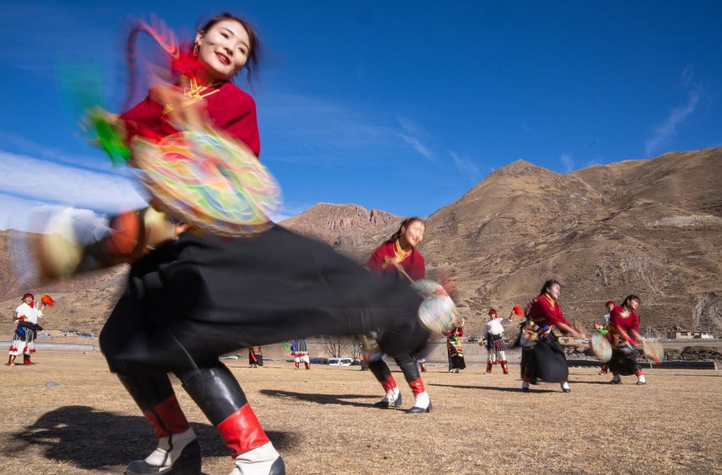 西藏昌都市丁青县尺犊镇乌巴村文艺演出队在跳热巴舞(1月5日摄)。新华社记者 丁增尼达 摄