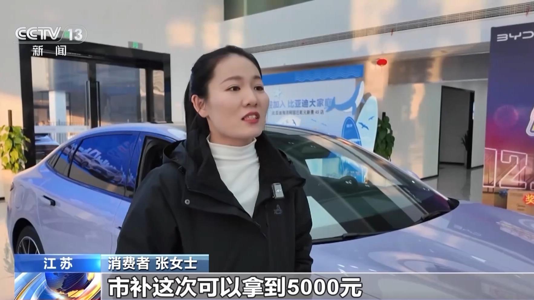 消费者 张女士:我自己看中的车子,可以拿到省补9000元的补贴,市补这次可以拿到5000元,相当于14000元,而且新能源车型它也没有购置税,性价比非常高。(来源:央视新闻客户端)