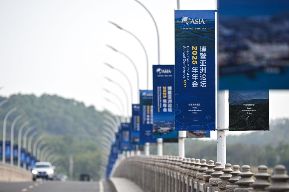 海南博鳌大乐大桥上的博鳌亚洲论坛2025年年会主题宣传牌(3月20日摄)。新华社记者 蒲晓旭 摄