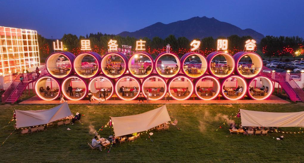 5月5日,游客在河北省遵化市夕阳谷景区游玩时品尝美食(无人机照片)。