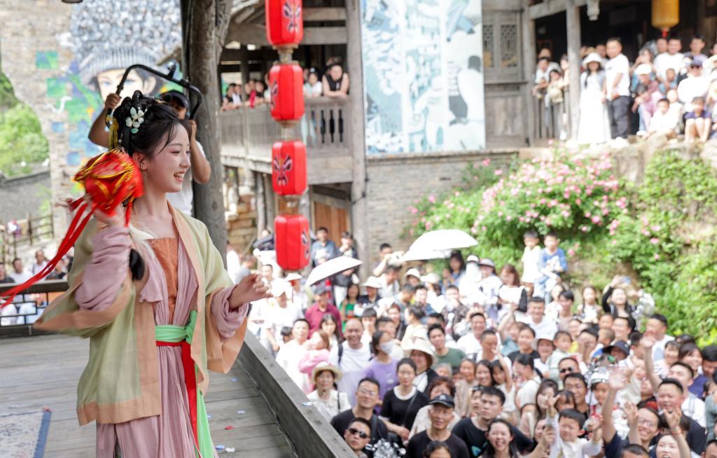 5月1日,在贵州省遵义市乌江寨景区,身着传统服饰的年轻人与游客进行抛绣球互动。