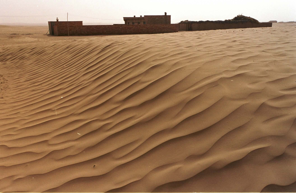 2002年拍摄的资料照片,宁夏盐池县冯记沟乡黎明村土地沙化,村民院落被流动沙丘包围。新华社记者 刘泉龙 摄