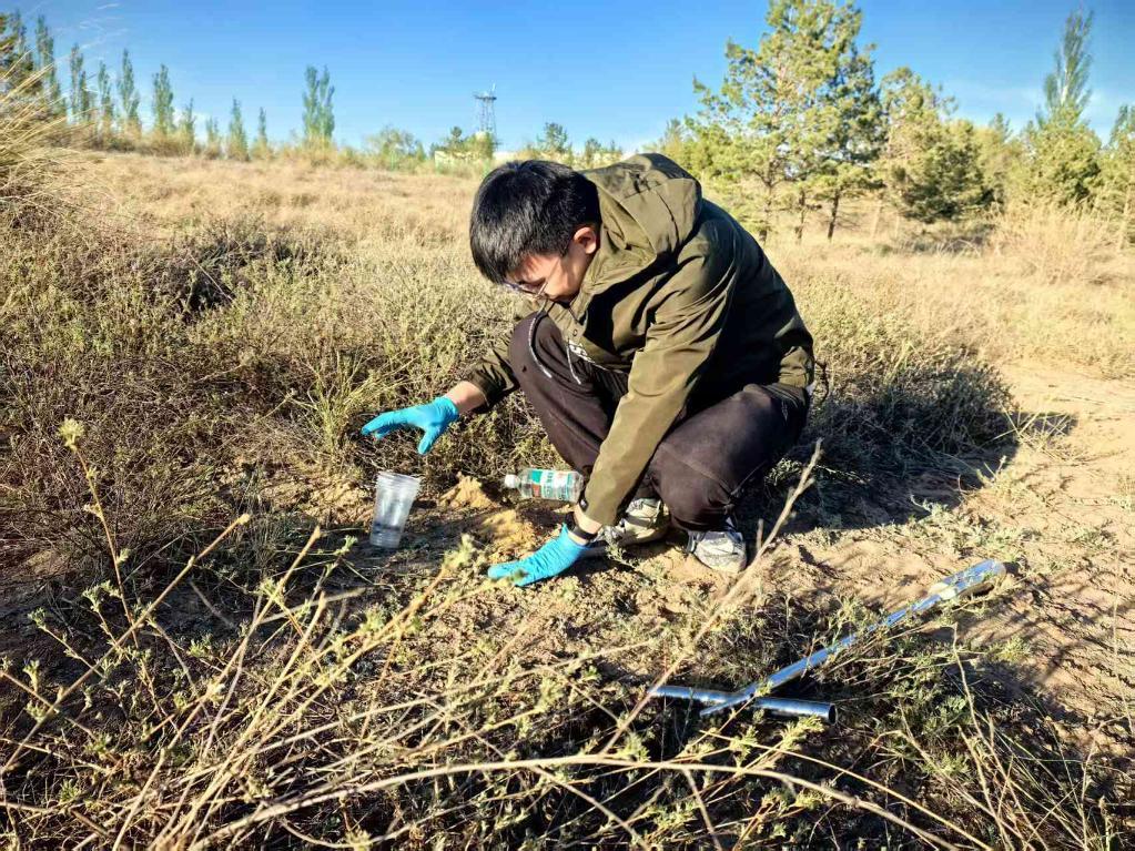 北京林业大学博士生农皓钧在野外做荒漠土壤动物研究。新华社记者 马丽娟 摄