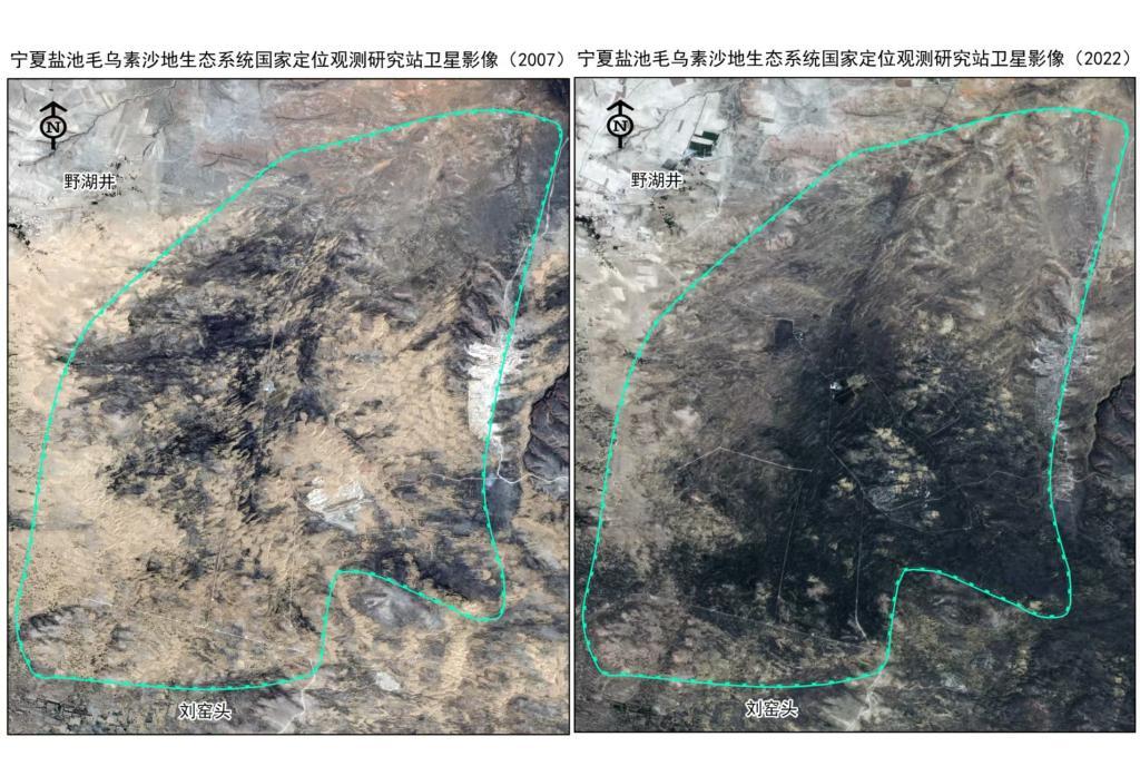 宁夏盐池毛乌素沙地生态系统国家定位观测研究站2007年和2022年卫星影像对比图。(受访者供图)
