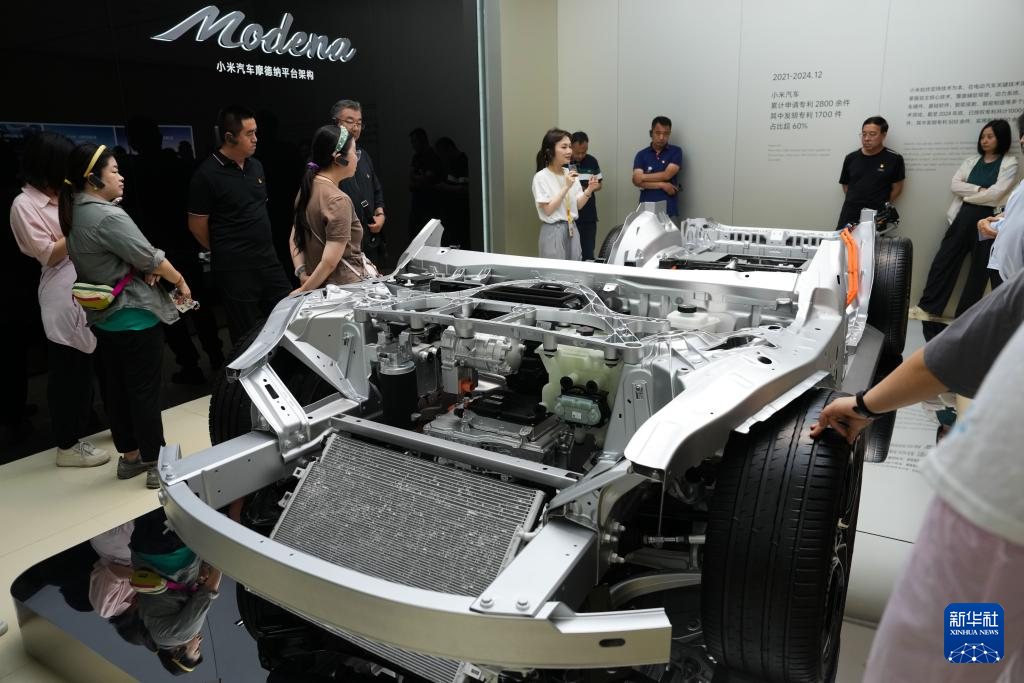6月16日,参观者在北京小米汽车工厂的科技展厅了解小米汽车摩德纳平台架构。新华社记者 郑焕松 摄
