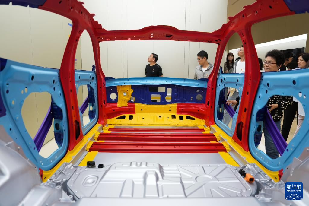 6月16日,参观者在北京小米汽车工厂的科技展厅了解小米汽车铠甲笼式钢铝混合车身。新华社记者 郑焕松 摄