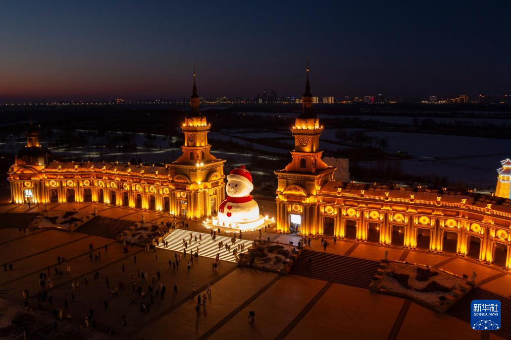 游客在哈尔滨群力音乐公园音乐长廊游玩(2025年1月3日摄,无人机照片)。新华社记者 谢剑飞 摄
