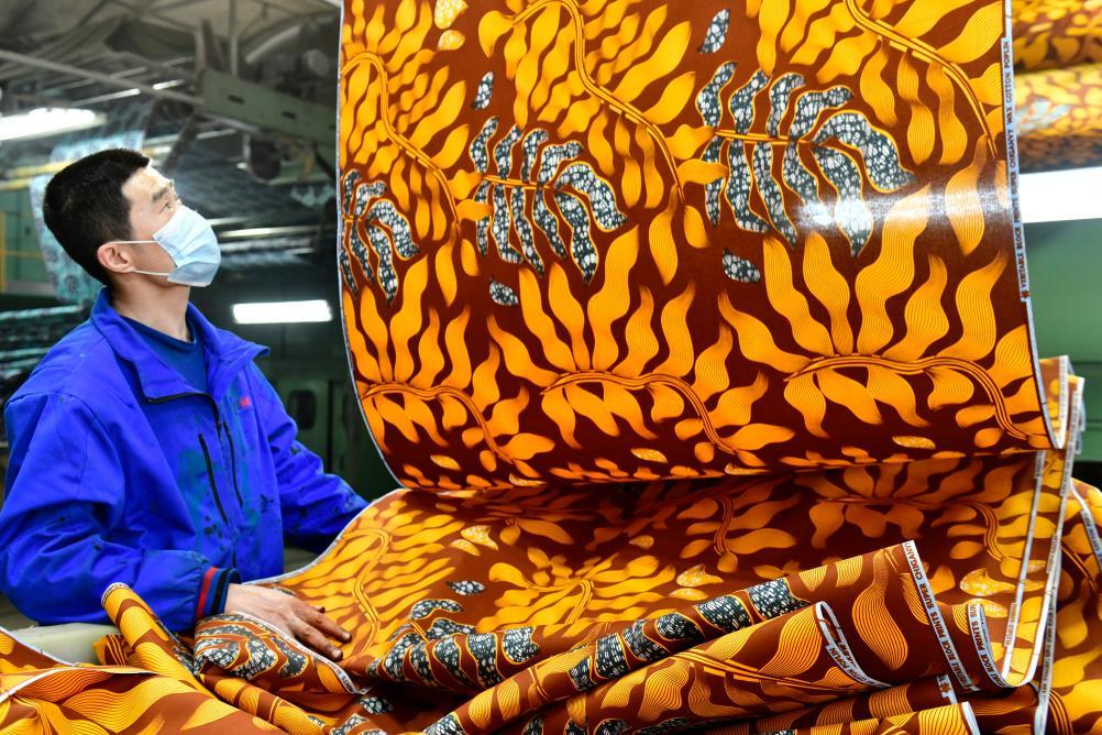 2025年2月25日,在位于山东省滨州市的愉悦家纺有限公司,工作人员在生产出口非洲的布匹。新华社记者 郭绪雷 摄