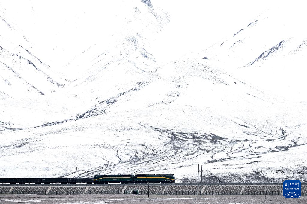2024年5月27日,列车行驶在昆仑山下的青藏铁路上。新华社记者 张龙 摄