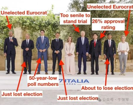 我看到,西方的政治新闻网,一篇文章的大标题,就是“六只跛脚鸭和梅洛尼”,感叹2024年的这次意大利G7峰会,是多年来最虚弱的一次领导人聚会,“与其说是西方力量的展示,看起来更像是最后的晚餐”。