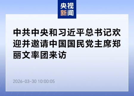新华社台北3月30日电(记者黄扬、姜江)中国国民党主席办公室30日表示,中共中央和习近平总书记邀请郑丽文主席率团前往大陆访问,郑主席表示感谢并欣然接受邀请。期望两党共同努力,推动两岸关系和平发展,促进两岸交流合作,为台海谋太平,为民生增福祉。