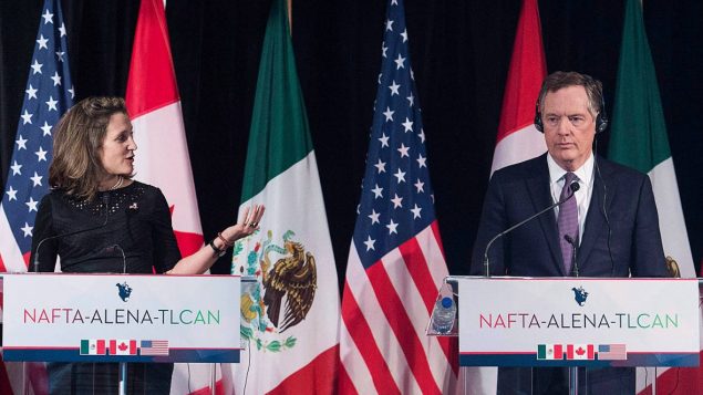 星期二(4月24日)在美国首都华盛顿的北美自由贸易协定(NAFTA)谈判中,加拿大外长弗里兰德(Chrystia Freeland)和美国贸易代表莱特希泽(Robet Lighthizer)在关于协议的“日落条款”的讨论中强硬交锋,互不相让。两人之间的气氛骤然紧张起来。