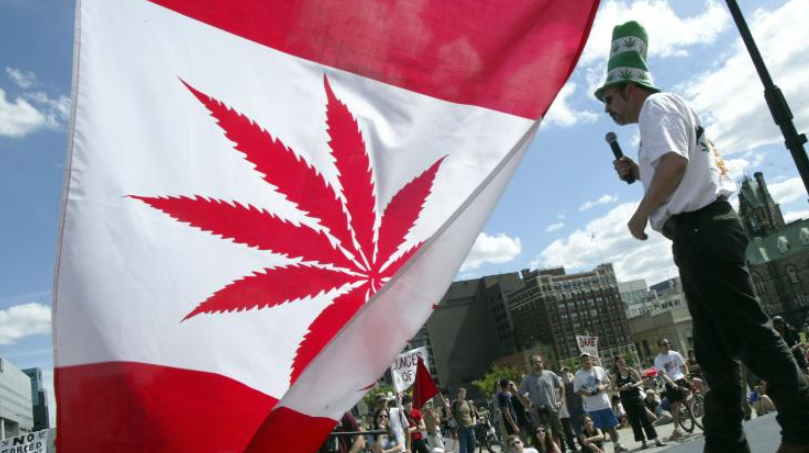 在加拿大,狂热的大麻合法化支持者将大麻画到了加拿大国旗上 图源:CNN财经