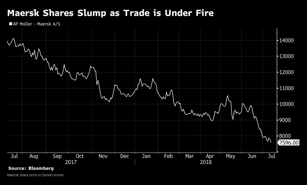 事实上,今年以来,马士基股价整体呈下跌趋势,与一年前相比,其股价已下跌37%,市值更是蒸发近三分之一。 Jefferies分析师大卫·克尔斯滕(David Kerstens)在接受彭博电话采访时表示,“由于美国对中国进口产品征收关税,这对今年剩余时间内集装箱运费需求的发展产生了很大的不确定性……显然,贸易战势态的升级,进一步影响了跨太平洋贸易往来的风险。” “但是,如果情况贸易战进一步升级并影响其他航线,包括跨大西洋贸易,上述情况就可能会改变,”克尔斯滕斯说。 彭博行业研究(Bloomberg Intelligence)的高级分析师授拉胡尔·卡普尔(Rahul Kapoor)表示,“集装箱运输关税的影响可能会很明显……我们认为最好的贸易增长已经过去了。如果三季度运营商的盈利能力有所增加,那么他们将不得不快速减少运力,阻止运费下降。” 分析师普遍削减对马士基的股价展望。 哥本哈根Nordnet投资经济学家皮尔·汉森(Per Hansen)表示,马士基目前处于“飓风眼”中心。他估计该公司的股价可能下跌至少10%。 新加坡运输业分析师方华婷(Corrine Png)认为,马士基的估值可能会在未来几个月内降至低谷,投资者会避免航运股,除非更多过剩产能被淘汰。 她还说,与去年相比,马士基将更难以有效地转嫁更高的燃油成本,这令马士基今年最多只能赚取微利,甚至要面临亏损的风险。 彭博社称,人们担心成本将攀升至40亿至50亿美元。根据彭博社对12位分析师的调查,普遍认为马士基今年收入仅为36.8亿美元。 对于市场的担忧,马士基早前已因季节性因素影响,认为今年下半年将出现需求低迷,并为此做了准备。该公司本月早些时候表示,因此需要暂时缩减其在亚洲和北欧之间的服务。![]()