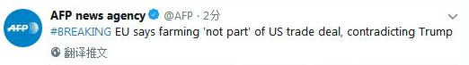 然而法新社7月27日报道称,欧盟表示,农业不是与美国贸易协定的一部分,这与特朗普之前的表态相矛盾。