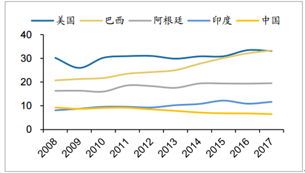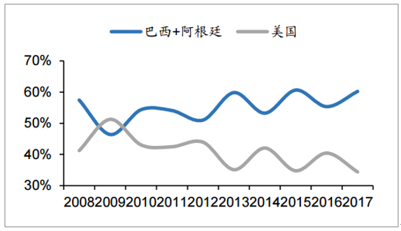 另外,在2017年全球9440万吨大豆期末库存中,库存量较大的前两个国家分别为阿根廷(3120万吨)和巴西(2167万吨)。由各国种植面积考虑,2017年巴西种植大豆3330万公顷,超过美国成为种植大豆面积最大的国家。