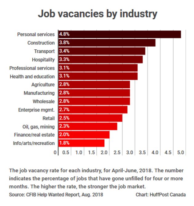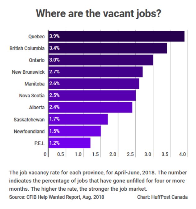 加拿大独立商会(CFIB)名为“Help Wanted Report”的最新调查也证实,本国就业形势确实喜人,在今年第二季度,全国共有397,400个职位空缺长达4个月甚至更长时间未被填补,这意味着3.1%的空缺率。换句话说,全国每100个职位中,就有3个职位空缺。