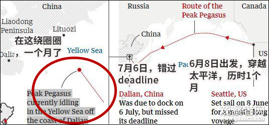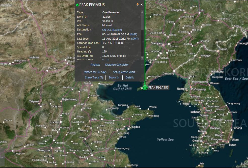 根据卫星图显示,“飞马峰号”进入大连港。图片来自路透社