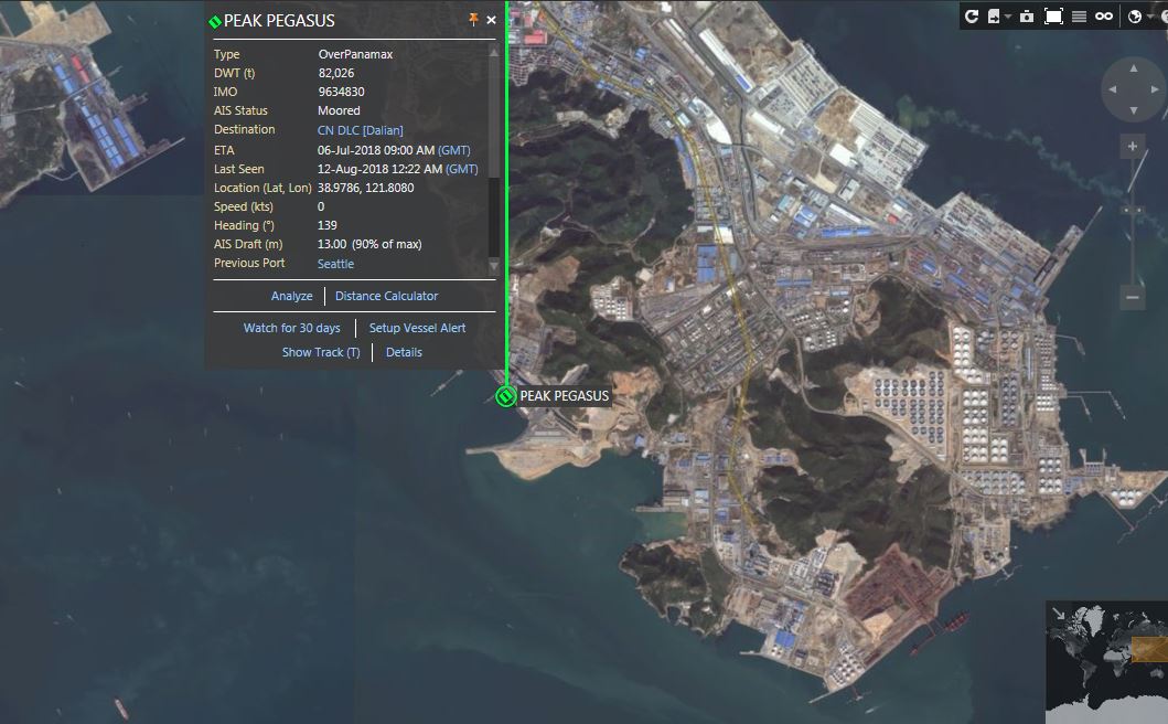 根据卫星图显示,“飞马峰号”已停靠大连港。图片来自路透社
