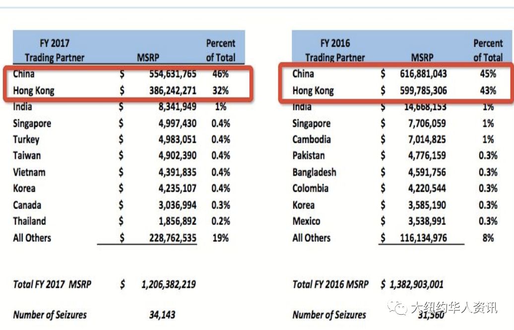 而根据CBP的最新数据,几乎80%被扣押的假货,都来自中国和中国香港。