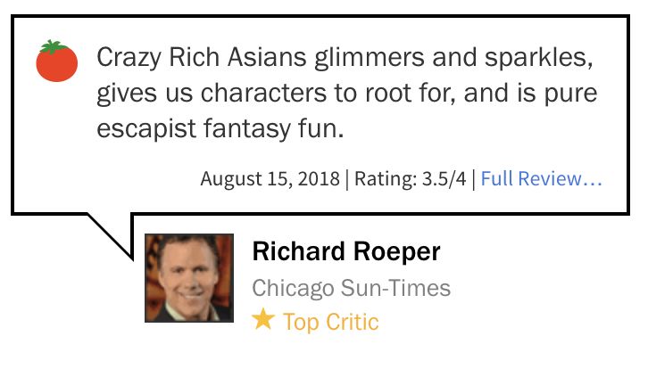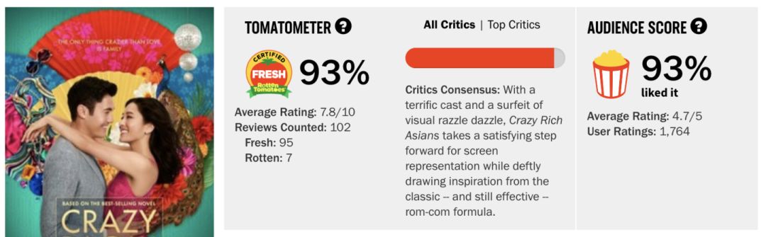 在烂番茄上,这部电影点映新鲜度达到98%,上映首日也仍维持了93%的高分。这是继1993年《喜福会》之后,首部以全亚洲演员为题的好莱坞英文电影。