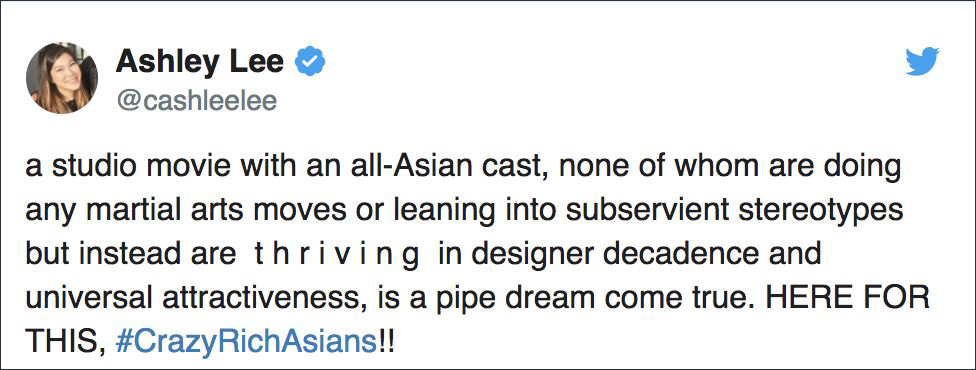 华裔记者艾希礼·李(Ashley Lee)发推文说:“终于有一部全亚裔阵容,而且不是武打片的电影了!没有刻板印象,只有富于设计感的场景和充满吸引力的人物!”