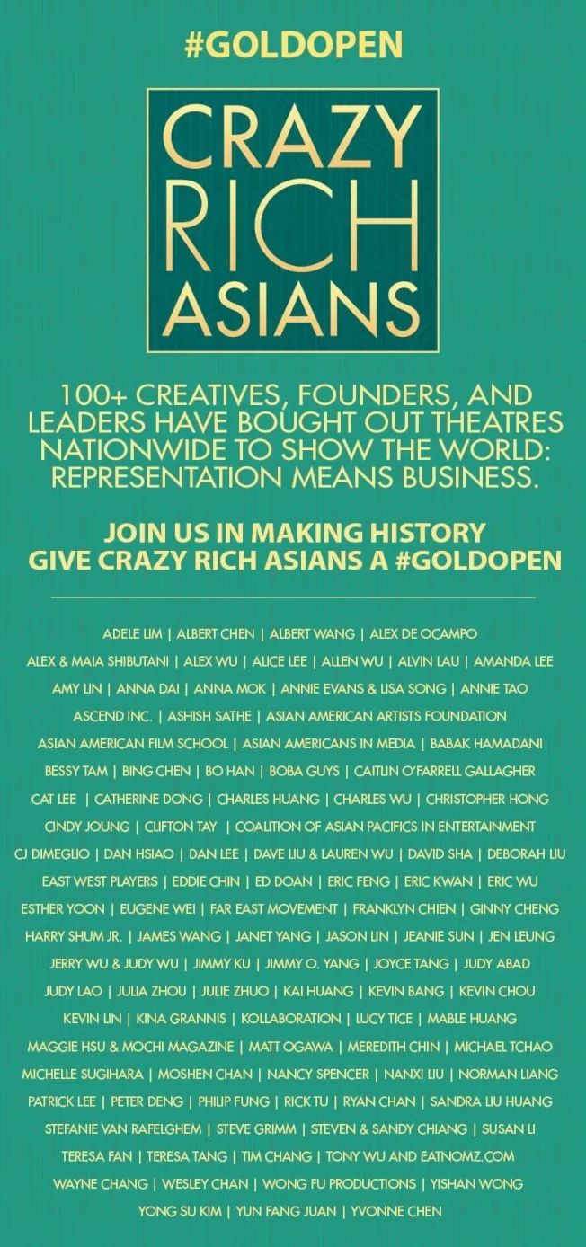 iWeekly周末画报指出,为推广这部全亚裔阵容的影片,百位亚裔企业家、明星在社交网络发起#GoldOpen活动,在全美各地包场观看该电影,效仿非裔观众在《黑豹》上映时的做法为全亚裔阵容影片打Call。
