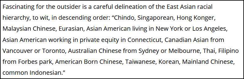 《邮政杂志》(Post Magazine)还曾报道,作者给外国人“科普”了一下东亚人种阶级分层,从高到低排序,依次为:印尼华人、新加坡人、中国香港人、马来华人、欧亚混血、纽约和洛杉矶的美籍亚裔、康涅狄格州的美籍华人、温哥华和多伦多的加籍亚裔、悉尼和墨尔本的澳籍华人、泰国人、福布斯公园(富人区)的菲律宾人、美国出生的华人、中国台湾人、韩国人、中国大陆人以及普通印尼人。