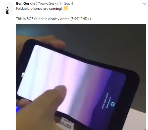 就在前几天,国外的知名博主 @Ben Geskin 在自己的 Twitter 上公布了一段关于京东方可折叠手机的视频。