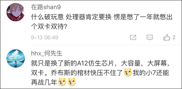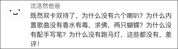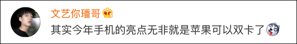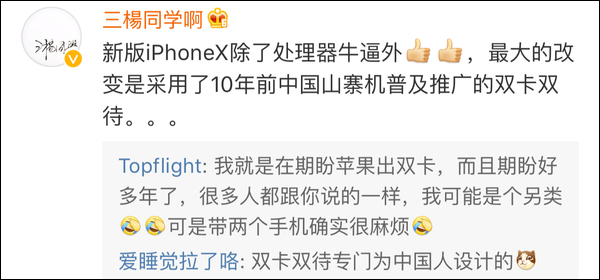 其中,“双卡双待”这一设置作为国产山寨机的标配,被人们认为是山寨机中最人性化的设置。 苹果公司拿着国产手机已经用了十多年的配置当做优势大肆褒奖,中国网友表示看不懂了:这玩意我们十年前就有你嘚瑟个啥?跑马灯了解一下呗?