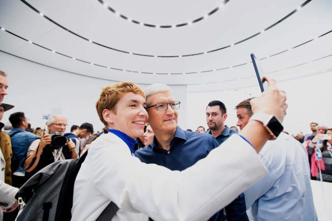 苹果执行长库克12日出席新手机发表会,受到苹果爱用者簇拥欢迎。(Getty Images)
