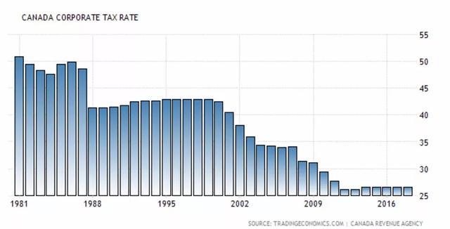 图:从1981年到2016年间,加拿大企业税的变化趋势图