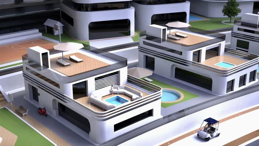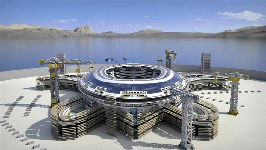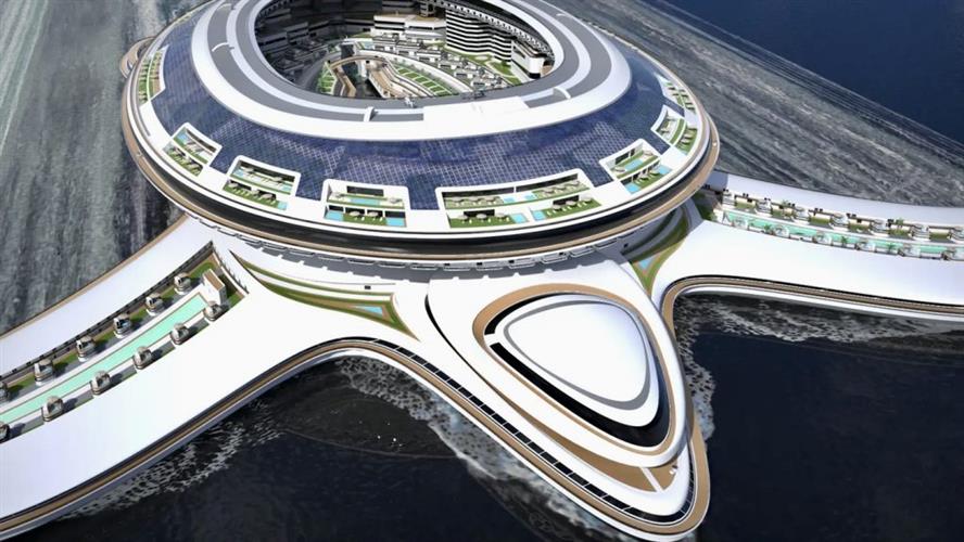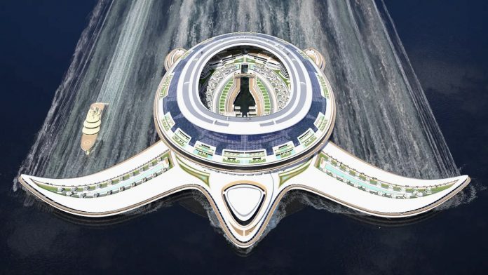 船体将由钢制成,并将以一个龟形的底座为特色,上面有一个椭圆形的结构,最多负载6万人,有酒店、购物中心、公园、船舶和飞机港口、豪华别墅、俱乐部,以及维持海洋中央的漂浮社区所需的一切。