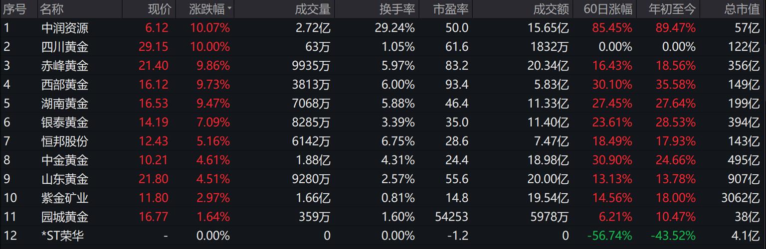 具体来看,中润资源(000506)、四川黄金(001337)涨停,赤峰黄金(600988)、西部黄金(601069)、湖南黄金(002155)涨超9%,银泰黄金(000975)、恒邦股份(002237)等涨超5%,剩余个股跟涨。其中,次新股四川黄金上市12日录得12板。