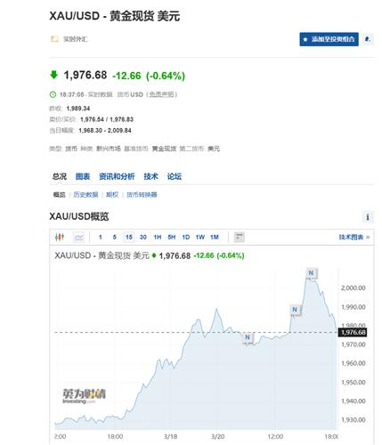 3月20日,现货黄金盘中一度站上2000美元/盎司,为2022年3月来首次,随后出现冲高回落。