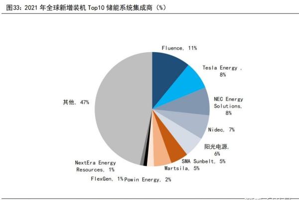 据 IHS Markit 对2021年全球新增储能装机功率容量统计排序, Fluence(11%)、Tesla(8%)、NEC(8%)分别位列全球新增储能系统装机前三,阳光电源位列全球储能系统集成商第五,全球市占率为6%,比亚迪未进入前十。