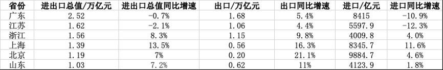 从进出口总值增速看,上海、浙江、山东、北京均有不同程度的增长,且增速均跑赢全国水平(5.8%)。从出口看,广东、江苏、浙江三省出口均突破万亿元,六省市出口增速全部为正,北京、上海、山东跑赢全国水平(10.6%)。