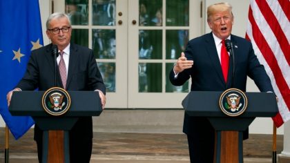 美国总统特朗普与欧盟领导人容克星期三在新闻记者会上 (Evan Vucci/Associated Press)