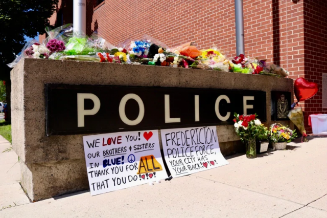 在弗雷顿警局门前,人们摆放鲜花和字条表达哀伤。