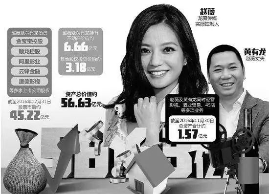 此外,截至7月26日,祥源文化共计收到203起证券虚假陈述责任纠纷案件,诉讼金额共计人民币3354.04万元。其中1起已撤诉,19起已于2018年7月18日召开庭前会议,剩余183起案件未开庭审理。 不过,公司面临的索赔还不仅于此。 “2017年1月12日至2017年3月30日期间买入祥源文化且截止2017年3月30日仍持有该股票的投资者,均可参与维权。”上海明伦律师事务所律师王智斌向凤凰网财经表示,目前征集到的受损投资者已经超过400人,总的金额还未全部核算,如果最终法院认定的时间段与其主张的一致,索赔总金额不会低于3000万。 广东环宇京茂律师事务所刘华浩向凤凰网财经表示,该案事实清楚,胜诉概率大,目前,刘华浩代理的受损投资者索赔金额约为500万元。 “目前提交法院立案的受损投资者数十个,索赔金额为1688万元,其他的受损投资者还在梳理当中。”上海创远律师事务所高级合伙人许峰律师表示,目前已有几十位祥源文化的投资者向其申请代理维权,近期将继续向法院提交材料立案。据许峰分析,龙薇传媒变更法定代表人不会影响其承担相应的民事责任。并且他向凤凰网财经表示,“一旦法院确定了法院本身所认可的买入卖出条件,不管人数规模,还是损失规模,都将井喷。” 据此计算,索赔金额已超5000万元。 曾纵横香港证券市场 在遭遇万家文化收购“滑铁卢”之前,赵薇和其夫黄有龙曾经纵横资本市场。 赵薇夫妇最受注目的一次投资应该是在2014年12月20日,黄有龙100%控股的公司Gold Ocean Media斥资31亿港元买入阿里影业9.18%的股份,成为公司第二大股东。四个月后,阿里影业出现两天的暴涨,涨幅达到50%,赵薇夫妇便赚得30亿港元。 次月赵薇夫妇减持阿里影业1.22%的股份,套现9.98亿港元。Wind资料显示,截至2016年6月30日,赵薇与黄有龙的投资公司GoldOcean Media为阿里影业第二大股东,持股167428.25万股,占比6.63%。 除阿里影业外,赵薇以2.44%的投资比例成为上海云锋新创股权投资中心(有限合伙人)的股东,此投资中心的法人是以马云为股东的上海云锋新创股权投资管理中心(有限合伙)。2016年9月,圆通速递成功借壳上市,成为快递行业首家上市公司,而云锋新创正是圆通的股东之一。 而目前,不仅赵薇面临巨额索赔,黄有龙在香港的资本规模也大幅收缩。2018年1月11日,云锋金融发布公告称,黄有龙由于“拟专注其个人其它业务之原因,已辞去非执行董事职务”。 在顺龙控股2017年的年报中,黄有龙还为公司第一大股东及执行董事,其持有股票351100.00万股,持股比例为67.50%。而公司在2018年4月17日发布公告称,由于市场禁入决定书及行政处罚决定书的原因,黄有龙已辞任公司主席及执行董事,以及董事会提名委员会主席职务。 金宝宝2017年中期报告中显示,黄有龙和赵薇持有的公司股票共占公司股本总额的38.06%;而在金宝宝2017年年底的财报中,已不见两人姓名。 公开资料显示,赵薇持有的唐德影视股份为584.99万股,在前十大流通股股东排第9位。但受多个事件影响,6月以来唐德影视股价一路下跌,以近50%的跌幅暂列影视股收益榜倒数第一位,自6月1日至8月6日,股价从16.37元跌至8.7元。如果赵薇在此期间没有减持,其持股市值估计缩水4486.87万元。 目前,据天眼查数据,与赵薇相关的公司(由其担任法人、股东或高管)有16家。其中,赵薇担任法人的公司有三家,包括上海欣艺文化传播有限公司、赵赵(上海)影视文化工作室和上海星星商务咨询有限公司。 赵薇担任股东的公司有15家,包括西藏龙薇文化传媒有限公司投资比例(投资95%)、北京普林赛斯文化传播有限责任公司(投资70%)、合宝文娱集团有限公司(投资4.51%)等。 赵薇担任高管的公司有7家,包括芜湖中星汽车销售服务有限公司(董事)、龙旭新(北京)商贸有限公司(监事)等。 天眼查显示,目前在与赵薇相关的16家公司中,12家处于开业或续存状态,包括北京普林赛斯文化传播有限责任公司、北京奥拉商贸有限公司、龙旭新(北京)商贸有限公司、上海云锋新创股权投资中心(有限合伙人)、心怡科技股份有限公司等。 而4家已注销或吊销,包括北京龙腾汇餐饮管理有限公司、上海欣艺文化传播有限公司、上海星星商务咨询有限公司、芜湖市鼎盛房地产开发有限公司。 (来源:?启阳路4号)