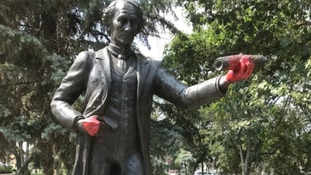 本星期二(8月21日)在萨斯喀彻温省会里贾纳市,有人在加拿大联邦首任总理麦克唐纳(John A. Macdonald,1815-1891)雕像的双手上涂上了红色颜料。仅仅在一个星期前,魁北克省蒙特利尔市中心的麦克唐纳雕像也被人