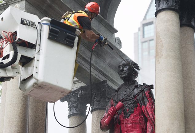 一个蒙特利尔市工人正在清洗雕像。(CP/Graham Hughes)