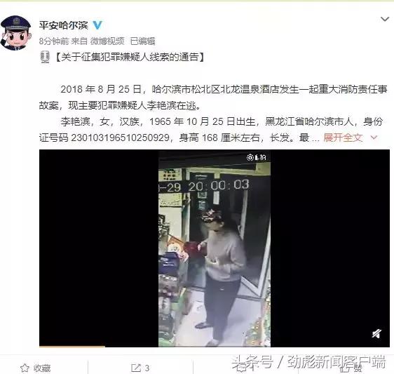 8月29日,哈尔滨市公安局发布悬赏通告,征集“8.25”哈尔滨大火的主要犯罪嫌疑人李艳滨线索。据央视新闻报道,李艳滨是事发酒店实际出资人。