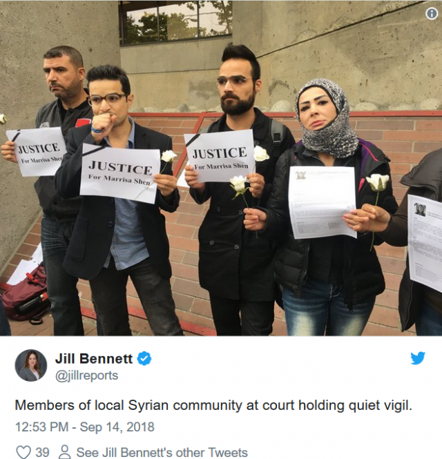 今天上午阿里出庭期间,BC省叙利亚裔加拿大人协会(Syrian-Canadian Council of B.C.)组织成员到场举行静默追思仪式,他们拿着白花,手持写有“JUSTICE”的纸片,向受害人申小雨表达哀思: