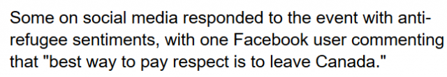 但社交网站很多网友并不买账,有明显反难民倾向的网友发帖说,叙利亚难民是装模作样,你们表达哀思或尊敬的最好方式是离开加拿大: