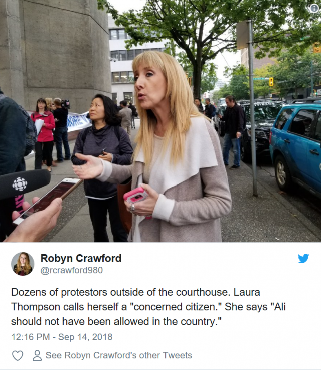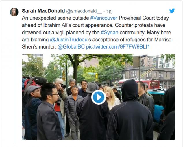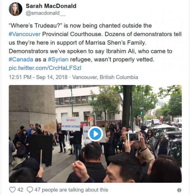 BC省法院外同时也聚集了一批抗议者,有民众直接指责联邦总理杜鲁多,称就是他要接收这么多叙利亚难民,导致了申小雨的无辜被害: