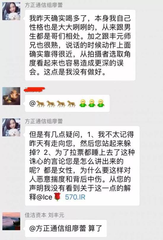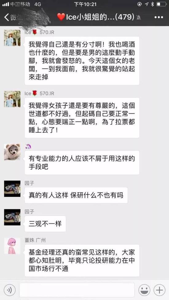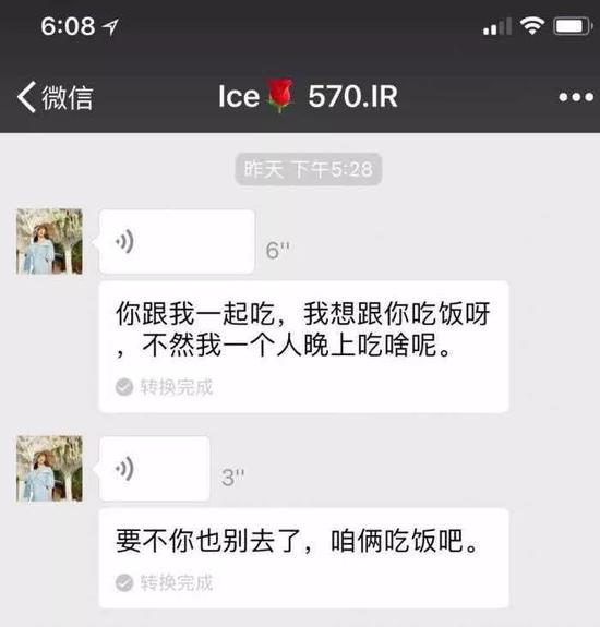 刘发布的微信截图显示,ICE姐饭局之前曾约他单独吃饭,这位已婚女士言语间不乏卖娇孟浪,“你跟我一起吃,我想跟你吃饭呀,不然我一个人晚上吃啥呢。不要你也别去了,咱俩吃饭吧。”
